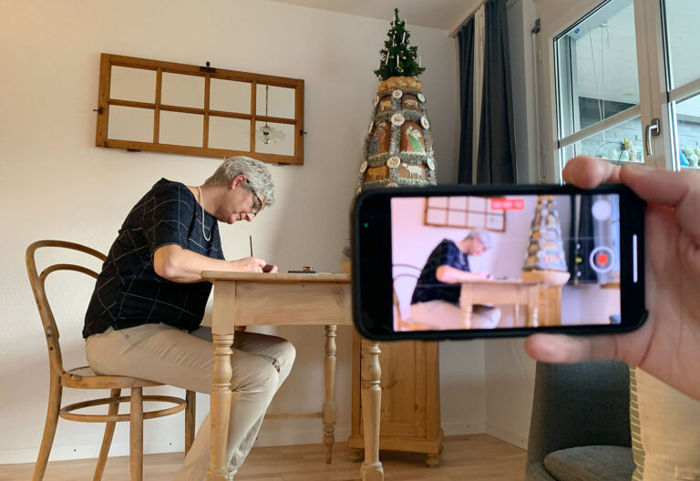 Die Produktion mit Smartphones ermöglicht eine flexible und unaufgeregte Realisation. Damit ist die Stimmung auf dem Set oft sehr diskret und intim. Für diesen Auftrag im Appenzellerland passt diese Form der Umsetzung perfekt: kleine, enge Räume, ruhige Atmosphäre, bescheidene Protagonisten. Eine Produzentin mit ihrem Handy kann den Voraussetzungen gerecht werden. Einziges Zusatzgerät: ein Gimbal. Das Stabilisierungs-Tool wird bei den Porträts für eine sanfte, gleichmässige Kameraführung eingesetzt, in erster Linie für Slow-Motion-Shots.